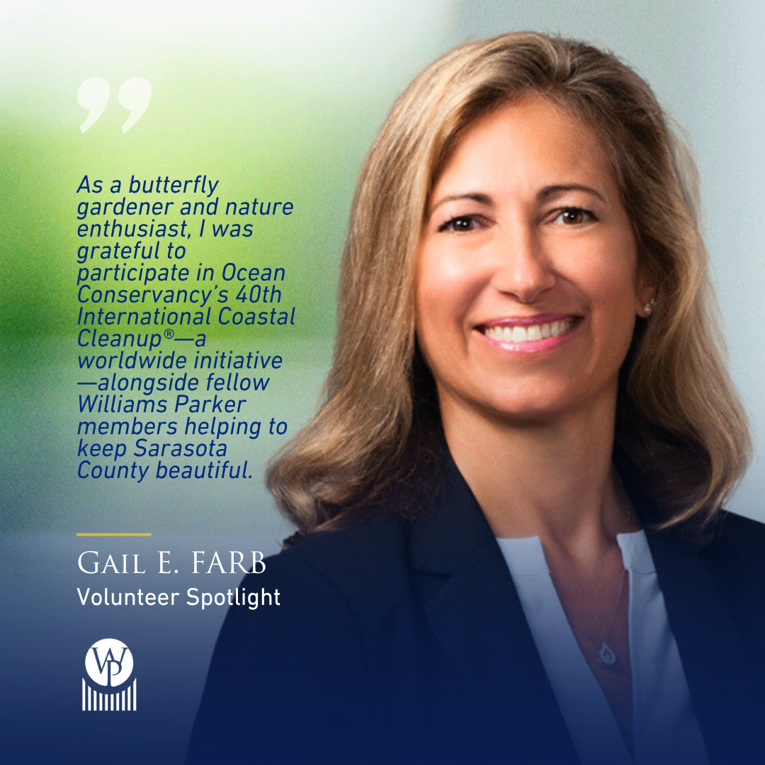Labor & Employment attorney Gail Farb joined Keep Sarasota County Beautiful—an affiliate of Keep America Beautiful®—for the Ocean Conservancy‘s 40th International Coastal Cleanup®, a global effort spanning 150+ countries to remove debris from shorelines and waterways.